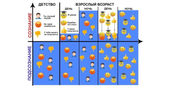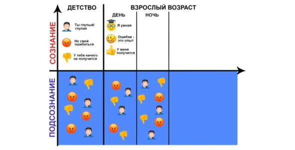 Если говорить психологическим языком, то из сознания событие переносится в подсознание. И что важно, переносится в подсознание не только событие, но и паттерн поведения (восприятия), влияющий на самооценку.