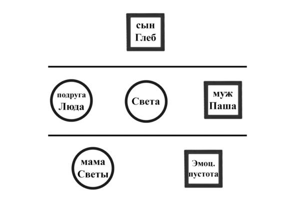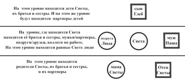 Предположим, у молодой женщины Светы есть муж Паша, сын Глеб, есть родители, а также подруга Люда. В соответствии с законами иерархии в системе Светы близкие Светы разместятся на трех иерархических уровнях (рис.16). Но на некоторых системных местах могут образовываться эмоциональные дыры. Как это происходит, описываю ниже.