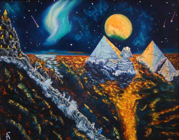 Когда я в храме сидел на троне,Словно статуя неподвижность храня,Люди падали на колени,Считая богом живым меня.Они забыли, они не помнят,Что жили когда-то в небесных краях,Что в душах тёмных тоже носятИскру божественного огня.Душа их во мраке сложила крылья,Забыв, как в небе вольной парить.Мечту заточили в стальную клеткуИ не желают её разбить.Моя ж душа, тоскуя, стремитсяВ страну проявленного огня.Чтоб, духом воспрянув, синею птицейЛетать – звездою ясной горя.Там можно облаком плыть в безвременье,Всех, прощая и всех любя.Лишь силой воли и намереньемМиры, золотые с улыбкой творя.12.99 г.Притяжение Египта