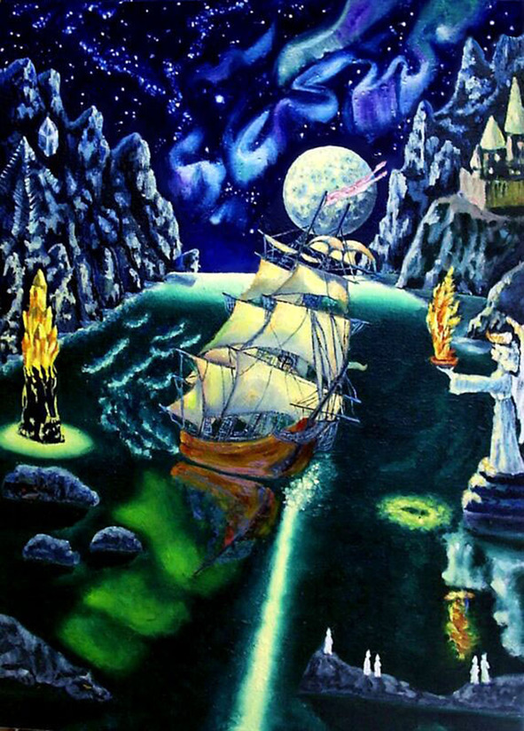Над головою чайки мечутся в агонии.Ночной фрегат вздымает в небо паруса.А ветер в предвкушении погониТумана клочья мне несет в глаза.В них – отраженье океана бесконечности,Где рябь волны катает хмуро утра ртуть.Тьма Мирозданья – лик являет Вечности.Приходит время вновь продолжить путь.Звезды Полярной луч пронзает бездну.Она отныне мой маяк в ночи.Она укажет путь мне в Атлантиду….Остановись на миг и помолчи.Ну, а сейчас – прощай знакомый берег.Я буду помнить о тебе вдали.Уже запел мне в снастях песню ветерО тайнах неизведанной Земли.Прекрасен белый айсберг в лунном свете.Мерцает красотою наземной.И, если верить белоснежной сей примете,Когда-нибудь… я обязательно вернусь домой!05.03 г.Египетский цикл