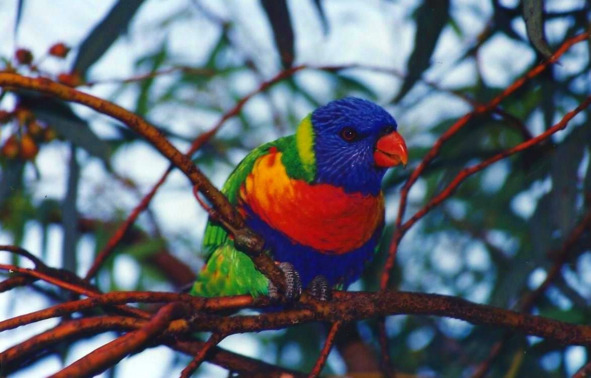 Самые разноцветные попугайчики – это Радужные Лорикеты. Крона дерева, населённая такими пёстрыми созданиями, выглядит как новогодняя ёлка.