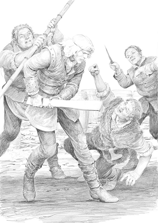 Улочку загородили три мощных дуболома с погаными, небритыми и немытыми мордами. Один, плечистый настолько, что казался почти квадратным, держал в руке окованную дубину толщиной с вымбовку кабестана[13]. Второй, в кожухе шерстью наружу, нес тесак, а за поясом торчал у него абордажный топорик. Третий, загорелый, словно мореход, вооружен был длинным и премерзко выглядевшим ножом.