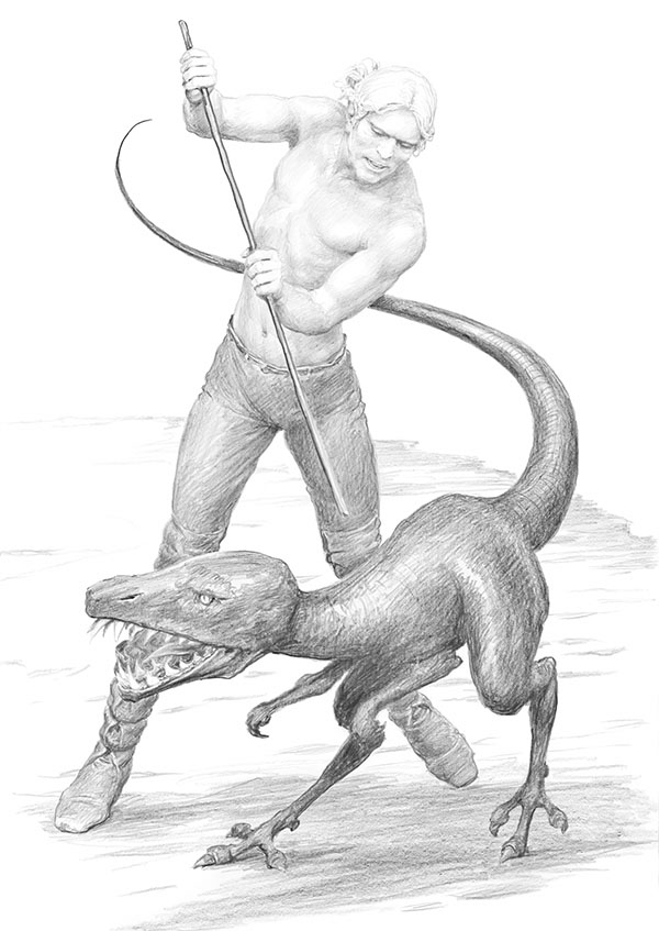 Двуногий ящер напоминал виверну, однако был помельче, с матерого дога. Зато с более крупной, чем у виверны, головой. И куда более зубастой пастью. И значительно более длинным хвостом, истончающимся, словно кнут. Этим хвостом ящер энергично бил, мёл песок, сек колья. Склонив башку, он прыгнул на ведьмака снова.