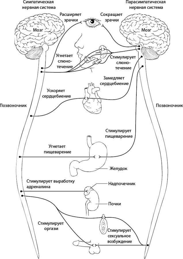 Как наш мозг говорит остальным частям тела, что им делать? Он отправляет им сообщения через нервы, которые тянутся от головного мозга вниз, по позвоночнику и к периферии тела. Одна из частей этой системы коммуникации довольно простая и знакомая. Это соматическая нервная система, отвечающая за сознательные действия. Мы решаем напрячь мышцу, и это происходит. Эта часть нервной системы позволяет нам обмениваться рукопожатиями, заполнять налоговые формы и танцевать польку. Есть другая часть нервной системы, связанная с внутренними органами, идущая мимо скелетных мышц, и эта часть управляет другими интересными вещами: покраснением, гусиной кожей, оргазмом. В целом мы меньше контролируем то, что говорит мозг потовым железам, чем, например, мышцам бедер. (Однако мы в некоторой степени можем контролировать работу этой автоматически функционирующей нервной системы; метод биологической обратной связи, например, основан на том, чтобы научиться произвольно и сознательно менять те или иные автоматические функции. Еще один пример – обучение работе на гончарном круге, когда мы постепенно приобретаем мастерство. На более простом уровне то же самое происходит, когда мы сознательно подавляем громкую отрыжку во время свадебной церемонии.) Нервы, тянущиеся к таким местам, как потовые железы, несут те или иные сообщения, и этот процесс происходит относительно непроизвольно и автоматически. Систему таких нервов называют автономной (вегетативной) нервной системой, и у нее есть все необходимое для того, чтобы запустить реакцию на стресс. В ответ на стресс одна половина этой системы активируется, а другая половина – наоборот, подавляется.
