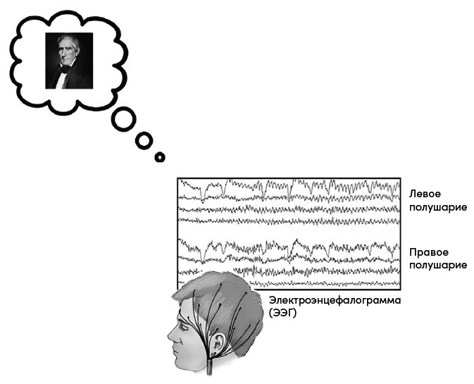 Итак, подумайте об Уильяме Генри Гаррисоне. Но для начала мы прикрепим к вашей голове электроды для снятия электроэнцефалограммы (ЭЭГ), которая позволит нам наблюдать за волнами нейронального возбуждения, возникающими в коре головного мозга, когда вы думаете о нем.