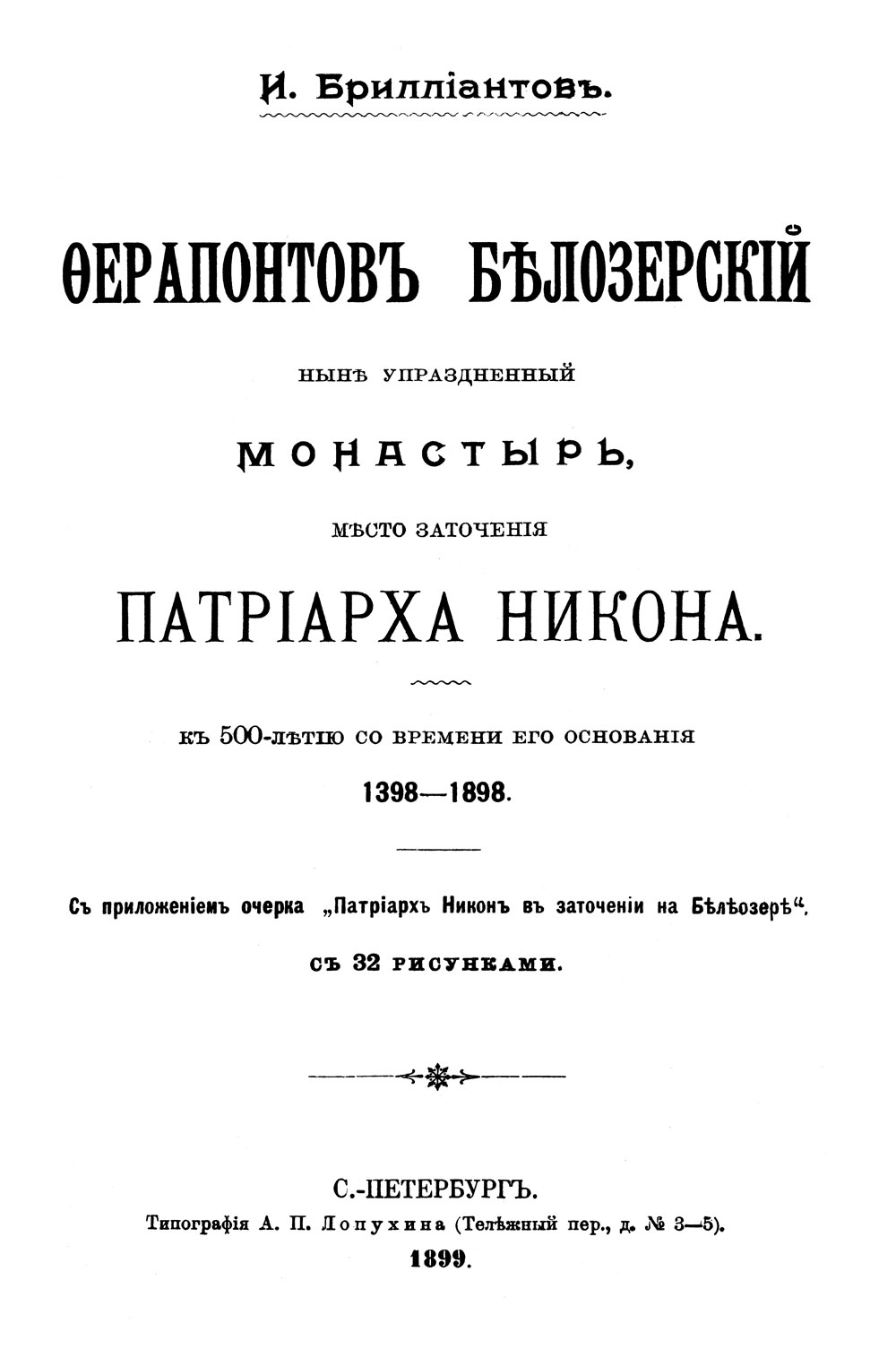 Книга И. И. Бриллиантова «Ферапонтов Белозерский, ныне упраздненный монастырь» (Санкт-Петербург, 1899)