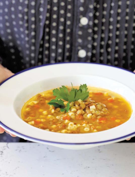 Многие еврейские блюда ведут свою историю от простой крестьянской еды, и то же самое можно сказать об итальянской кухне. У меня еврейские корни по отцу и итальянские – по матери, поэтому чечевица с пастой, или lenticche e pasta, – для меня яркий пример умиротворяющей домашней еды, которая греет душу и объединяет обе традиции. Вы можете приготовить этот суп на вегетарианском либо на курином бульоне , и тот и другой будет великолепно сочетаться с большим количеством свежего пармезана, насыпанного сверху, и с корочкой хлеба, которую вы будете в него обмакивать.