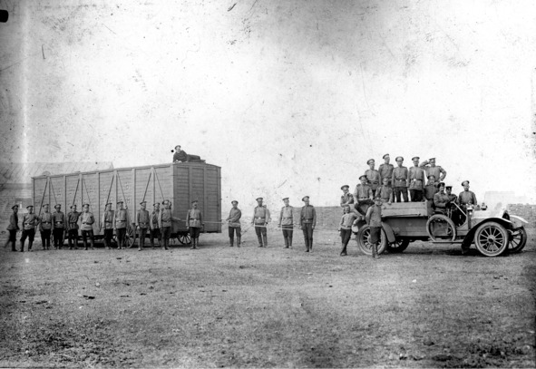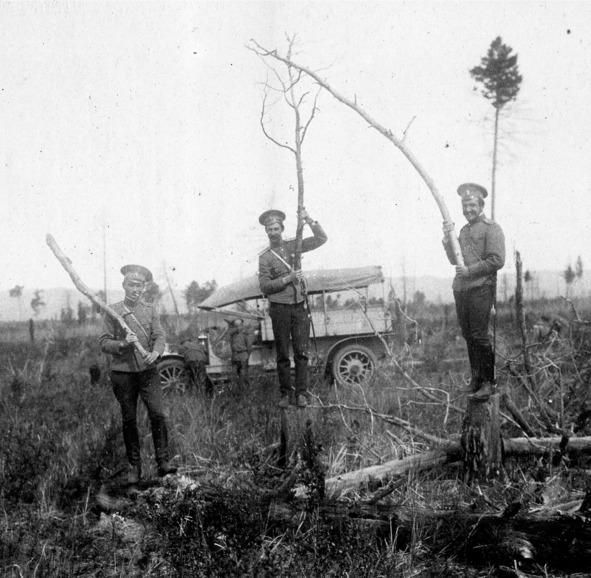 Фото 4. Штабс-капитан Прищепов, поручики Фирсов и Поплавко в поисках подручного материала для спасения засевшей в грязи автомобильной техники.