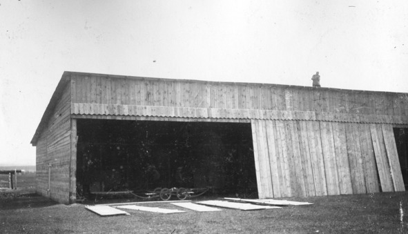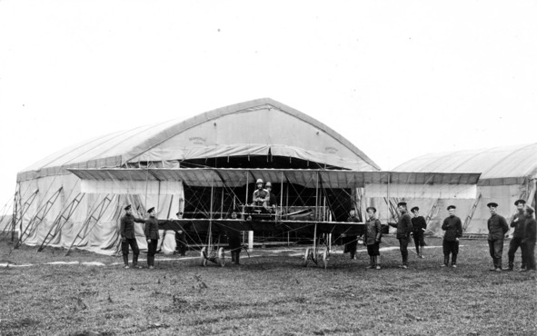 Фото 5. Поручик Борис Фирсов на аэроплане «Фарман-7» на фоне ангара Бессоно.