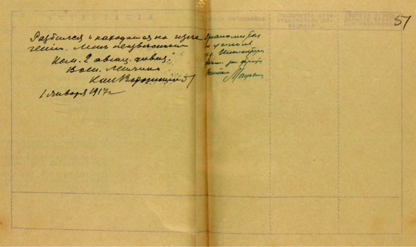 Прибыв в конце сентября месяца в 23 корпусный Авиационный отряд для проверки инженерного имущества, я не мог выяснить что должно иметься в отряде, что и когда получалось так как отчетность бывшим начальником отряда Поручиком Ивковым была совершенно запущена и ведена неправильно; так например в опись записывалось штатное и нештатное имущество вперемешку, но даже и материалы. Тогда мною было приказано принять имущество по наличию и представить мне ведомости, которые мной отданы в приказе. Этот приказ послужил основанием для ведения новой отчетности.