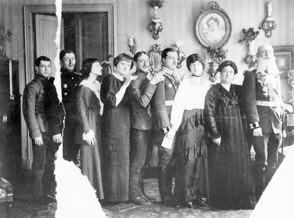 Фото 2. Семья генерала А. М. Кованько. 1910-е годы. Справа налево: Александр Матвеевич Кованько, его супруга Елизавета Андреевна, дочь Вера (в замужестве Нижевская), зять Роберт Нижевский, сын Александр, невестка Ирина, дочь Надежда (в замужестве Ивкова), зять Михаил Ивков, сын Андрей. Роберт Нижевский и Михаил Ивков, а также Александр и Андрей Кованько были летчиками, выпускниками ОВШ.