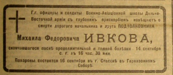 31 марта 1919 года Михаил Ивков стал начальником Спасской Военной Авиационной Школы ГИУ. 20 апреля 1919 года произведен в капитаны. С 25 июня 1919 года – подполковник. [29] Скончался Михаил Федорович после продолжительной и тяжелой болезни в Спасске в возрасте тридцати двух лет, 14 сентября 1921 года. [30]
