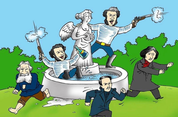 – Можно еще стих про осень вне конкурса? —попросил Есенин: -В небе тонут тучи, в лужах небеса. Рвет на жопе Васи Игорь волоса.