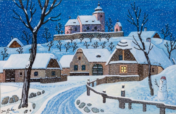 День начинался, выглянуло солнце, из всех печных труб уже шёл дым. Выбежали дети с салазками. Старичок в валенках решил посидеть на завалинке, закурил трубку. Начался колокольный звон, и сельчане потянулись к костёлу.