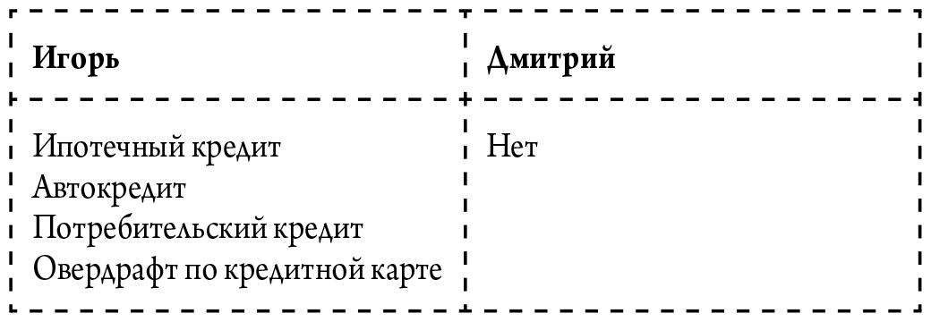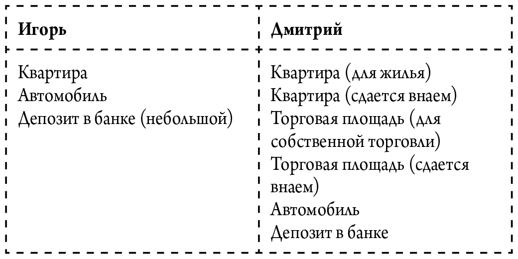 В таблице выше перечислены активы Игоря и Дмитрия с точки зрения бухгалтерского учета. Обратите внимание: квартира и автомобиль относятся к активам, хотя они не приносят доходов и, более того, требуют регулярных расходов.