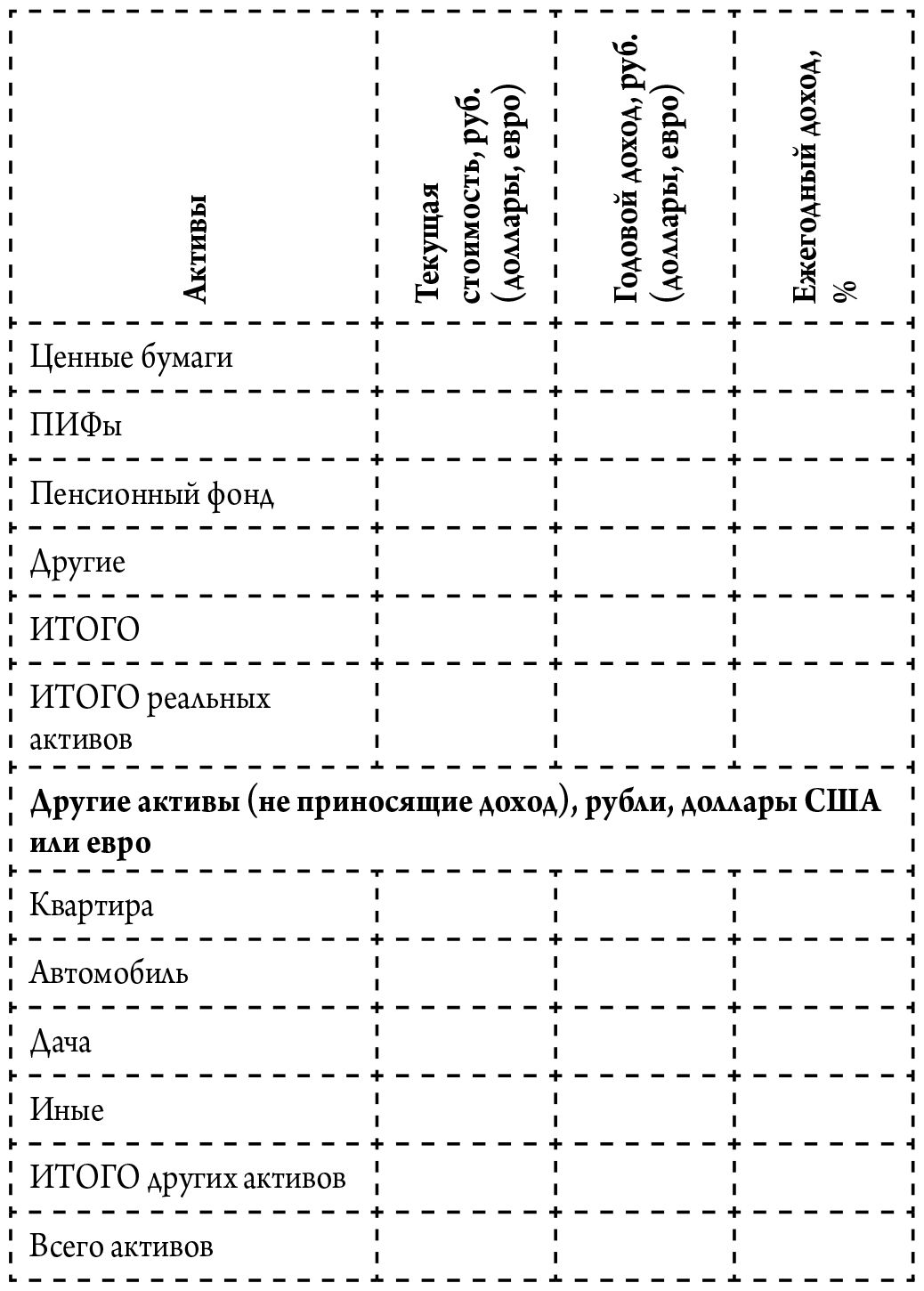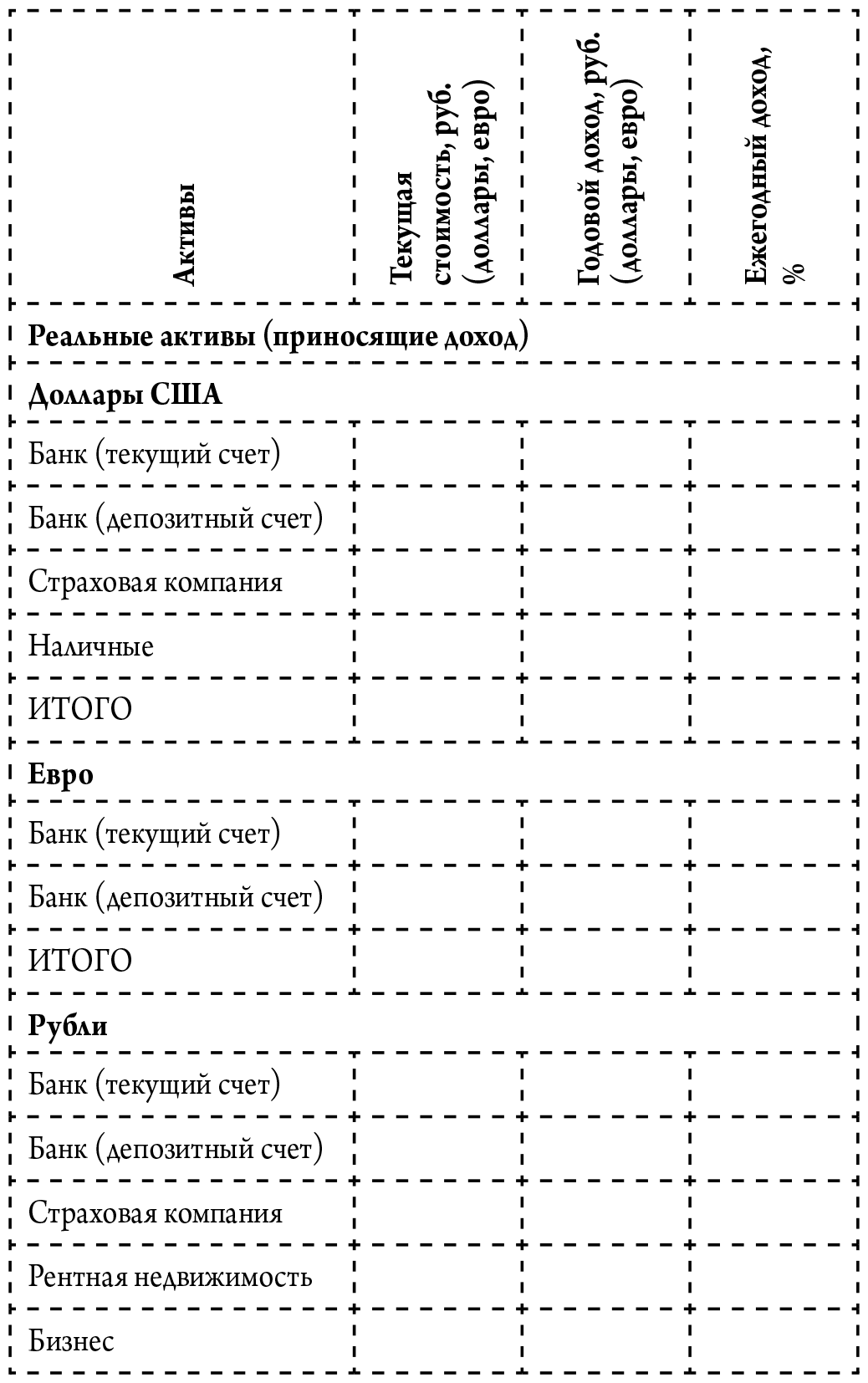 Ниже – пример таблицы для учета ваших активов (таблица 4).