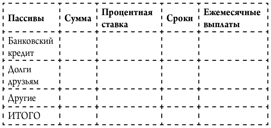 Вы уже знаете, что помимо активов, не меньшее значение для управления финансами имеют пассивы. Чтобы разобраться с ними, нарисуем еще одну таблицу (таблица 5).