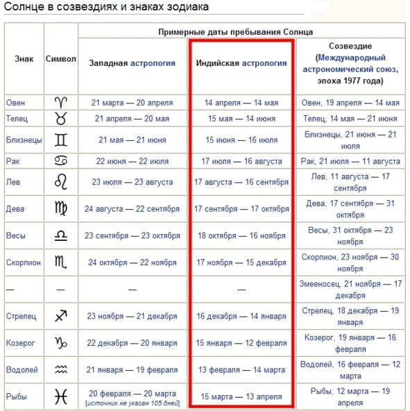 Приведем таблицу пребывания Солнца в западной и индийской астрологии, а также в астрономических созвездиях.