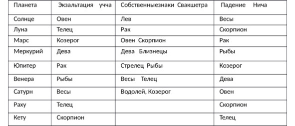 Планета в экзальтации или в собственном знаке на санскрите находится в самом сильном положении, где она проявляет все свои качества особенно ярко и эффективно. В собственных знаках планета сильна, но не так, как в экзальтации. В знаках падения, которые всегда находятся напротив знаков экзальтации, планета слаба и не может действовать во всю свою силу.