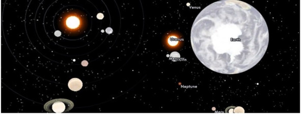 Вид Солнечной системы со стороны северного полюса Земли, которая слева от Солнца, Меркурий справа и ниже.