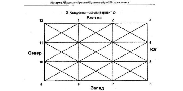 «Нарисуйте квадратную диаграмму. Разместите Мешу и Вришабху на восток, Карку и Симху – на юг, Тулу и Вришчику – на запад, Макару и Кумбху – на север. Укажите Митхуну в направлении „Агни-Кона“ (юго-восток), Канйу – в „Наитрартатйама“ (юго-запад), Дхану – в „Вайавйа“ (северо-запад), а Мину – в „Ишана“ (северо-восток)».