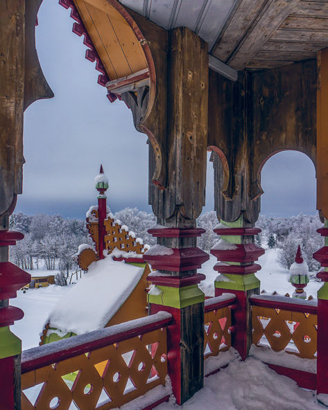 В 1903 году он реализует свою задумку, и перед восхищенными взорами местных жителей предстает настоящее деревянное чудо. Глядя на это здание в стиле эклектика, с экспрессивными декоративными элементами народного зодчества, я с трудом могла поверить, что передо мной, по сути, обычная крестьянская изба.