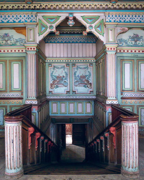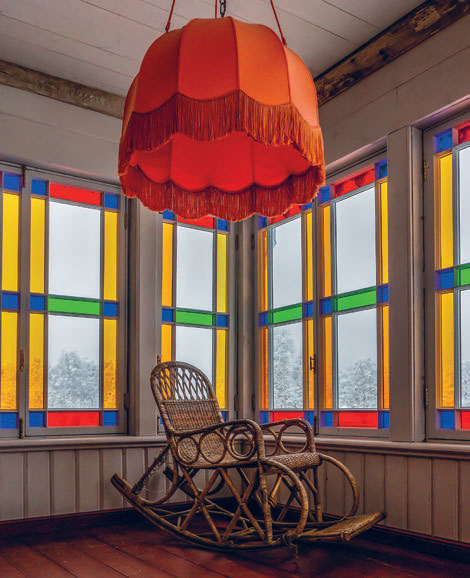 Специалисты, возрождавшие асташовский терем, конечно, не могут со стопроцентной уверенностью утверждать, какая обстановка была в доме при Мартьяне, но они постарались сделать антураж максимально аутентичным. Витражи на летней веранде были восстановлены по архивным фотографиям, масляные светильники XIX века переделаны в люстры местными мастерами. Старинную мебель собирали по соседним заброшенным деревням, а великолепные обои были воссозданы английским мастером Робертом Уэстоном по чудом сохранившемуся крохотному фрагменту.