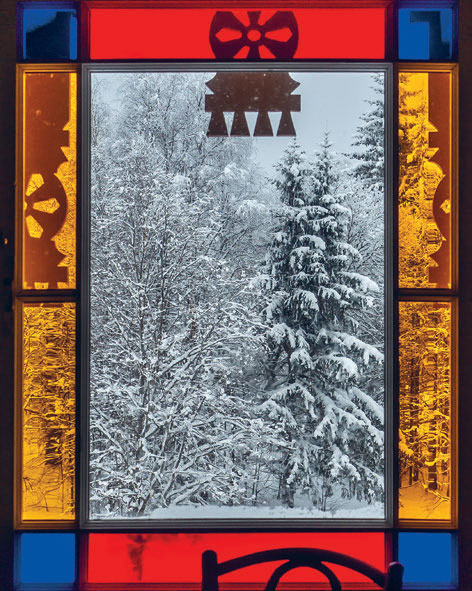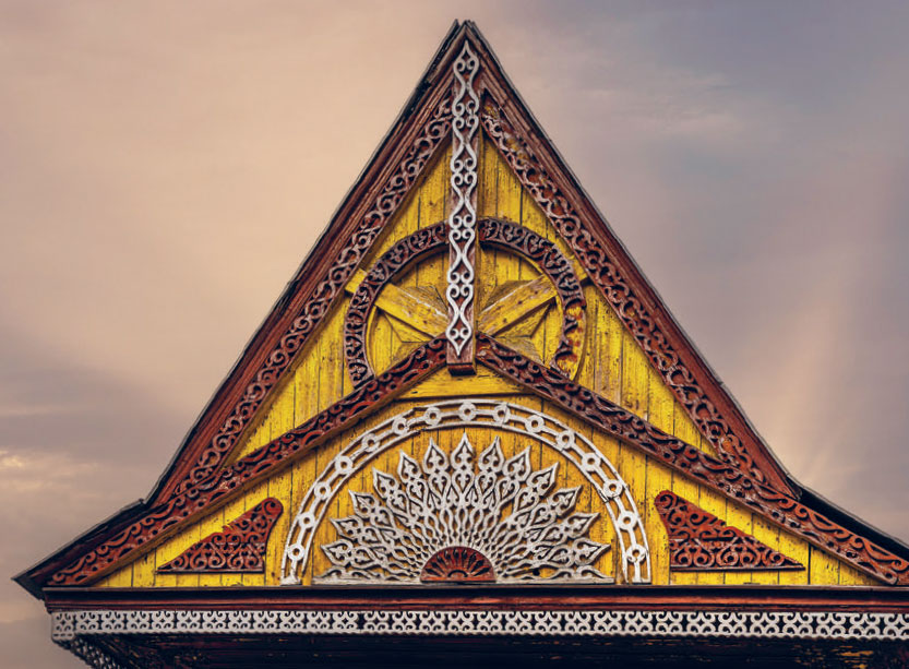 При этом городской флер не превращает терем в чужеродный для Погорелова объект: он совершенно органично смотрится на фоне деревенских пасторалей и благодаря деревянному кружеву будто сливается с окрестными лесами. Окна дома венчают ажурные кокошники, «вышивку» карниза дополняют резные полотенца, а фасад пестрит солярными знаками.