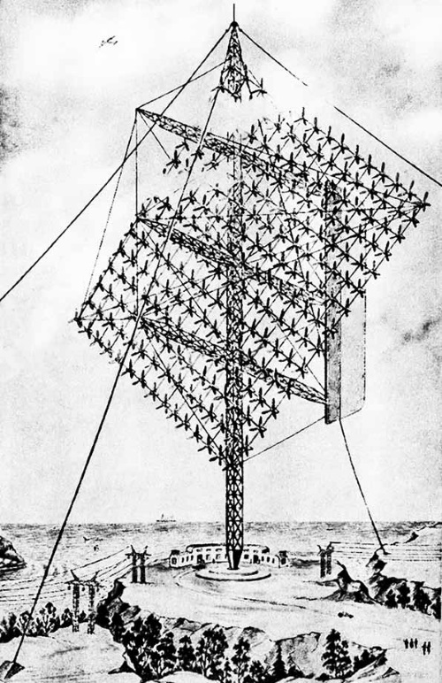 В начале 1930-х годов свои работы над новыми типами ветроустановок начали инженеры В. П. Ветчинкин и А. Г. Уфимцев. Заглядывая далеко вперёд, они предложили использовать многоветряковые рамные ветроэлектростанции. По этому проекту рамная сверхмощная ветроэлектростанция на 100 тыс. кВт состоит из 224 ветровых колёс (диаметр каждого – 20 м). Ветроколёса смонтированы на общей вертикальной раме, имеющей вид гигантского ромба: «Ромб укреплён на вертикальной поворотной башне, опирающейся своим нижним концом на гидравлический подпятник, а верхним укреплённой в подшипнике, удерживаемом расчалками. С лобовой и тыловой сторон ромба из его центральной башни выступают вперёд и назад горизонтальные решётчатые фермы с растяжками, увеличивающими жёсткость всей конструкции. Задние фермы несут на своих концах поверхность хвостового оперения. Цель этого устройства – повернуть ромб с ветровыми колёсами лобовой стороной на ветер»[46]. Размеры установки велики: ширина ромба до 500 м, вес около 10 тыс. т, высота 350 м (то есть почти равна по высоте самому высокому зданию на свете)[47]. Использование подобных установок – плотин для ветра – возможно было в различных районах страны (в том числе в Заполярье и на Новой Земле).