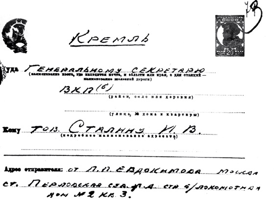 Служебная записка по поводу проекта К. А. Беляева «Реконструкция северного морского пути» и почтовый конверт на имя И. В. Сталина, в котором была направлена записка от П. П. Евдокимова «Великий Сев. Морской путь Сталина»