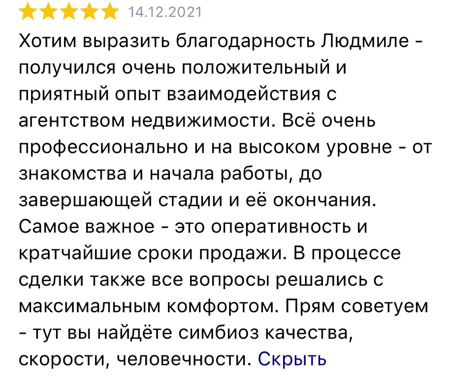 Недвижимость оказалась специфической. Однако я продала ее за 3 дня после подписания договора с первого показа. Клиент был в восторге. Он с удовольствием заплатил комиссионные, поблагодарил, еще и всем знакомым рассказал, какой чудесный агент ему попался. А ключевым стало то, что изначально он увидел во мне уверенность.
