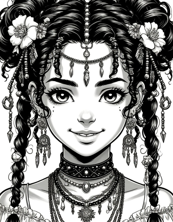 На Талло – длинная тёмно-синяя юбка из тонкой шерсти с вышитым белыми нитями жёлтым передником и что-то вроде блузки с короткими рукавами и наброшенном поверх неё золотисто-коричневым жилетом, оставлявшим полностью открытой грудь, которую обильно украшали ожерелья из ракушек, красных и синих бусин и цепочки из белого металла с беспорядочно свисающими камешками, перьями и птичьими коготками.