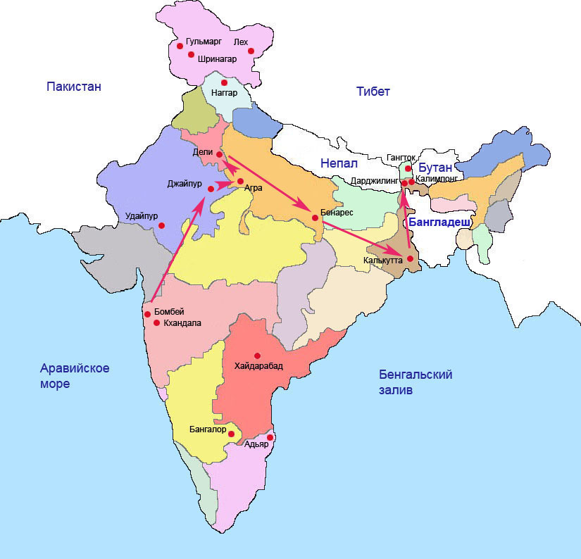 Конечной целью перемещения по Индии был Дарджилинг. По пути миновали Джайпур; Амбер, где родилась будущая жена Акбара Джодбай; Агру; Фатехпур-Сикри, столицу империи Акбара; Дели; Бенарес; Калькутту.