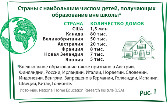 Семейное обучение – признанная форма и во многих других европейских странах, в частности в Австрии, Финляндии, Италии. В Чехии дети до 12 лет могут официально учиться на дому, подобный подход необычайно популярен в Венгрии. Альтернативные домашние школы появились даже в Японии, достаточно консервативной стране, после того как в Америке побывал японский репортер Ясуши Онума.
