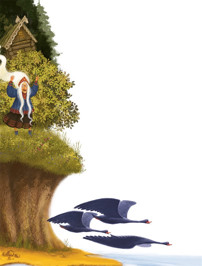Тут налетели гуси-лебеди, подхватили мальчика, унесли на крылышках. Пришла девочка, глядь – братца нету! Ахнула, кинулась туда-сюда – нету. Кликала, заливалась слезами, причитала, что худо будет от отца и матери, – братец не откликнулся! Выбежала в чистое поле и увидела, что метнулись вдалеке гуси-лебеди и пропали за тёмным лесом.
