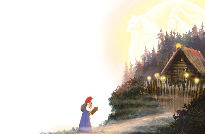 Василиса собралась, положила куколку в карман и пошла в дремучий лес. Идёт и дрожит. Вдруг скачет мимо неё всадник: сам белый, одет в белое, конь под ним белый, и сбруя на коне белая, – на дворе стало рассветать.