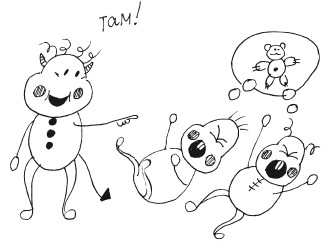 1) Ведущий становится в начало шеренги. Все по очереди вслед за ним повторяют его движения и слова. Ведущий простирает руку вперед и говорит «Вижу мишку!», дожидается, пока это повторит второй участник, и т. д. до последнего.