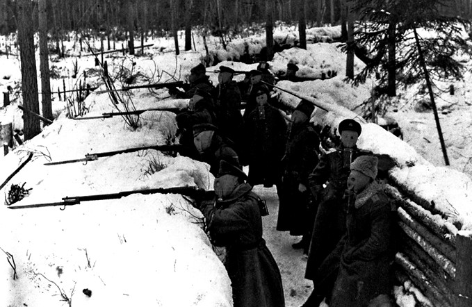 1917 г., январь. Латышские стрелки в Рождественских боях на позициях в противогазах в районе Пулемётной горки, Тирельские болота