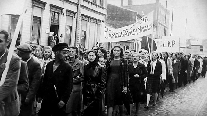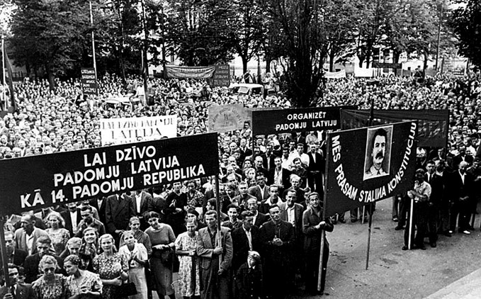 1940 г., Рига. Демонстрация 18 июля. На первом плане на транспорантах надписи на латышском языке: «Да здравствует Советская Латвия как 14 советская республика» и «Мы требуем Сталинскую Конституцию»
