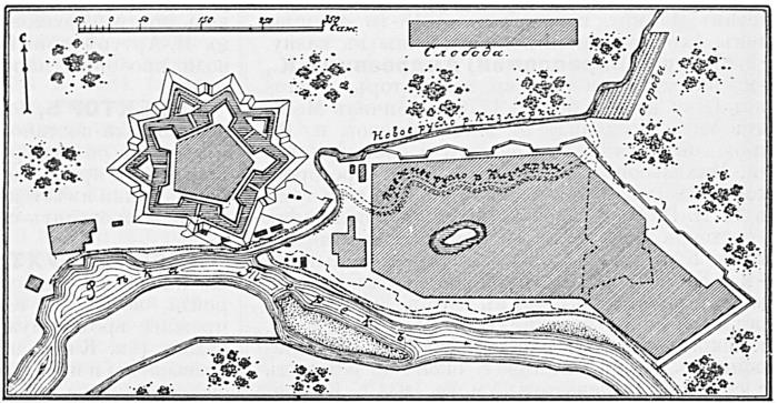 Омск, как известно, лежит под 54° 59’ с.ш. и 91° 3’ в.д., в расстоянии слишком 3,300 верст от С.-Петербурга, на небольшом возвышении берегов рек Оми и Иртыша. В то время это была крепость и город. Первая, построенная в 1708 году, состояла из землянаго вала со рвом, покрытым путем, траверзами и гласисом, расположенными по правилам Вобана; пред гласисом были утверждены рогатки с надолбами. Стоило только на берме, или на подошве рва, поставить палисад, чтобы доставить храброму гарнизону полную возможность держаться, хотя против какого неприятеля. На левом берегу Иртыша находился ретраншамент или цитадель. Цель его построения была – укрывать проезжающих от нападения хищников, в то время, когда не предстояло возможности переправиться чрез реку, в бурную погоду или за ходом льда.