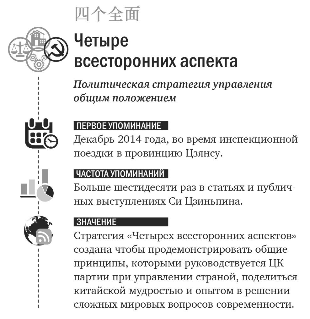 В течение чуть более одного года генеральный секретарь ЦК КПК Си Цзиньпин упомянул «Четыре всесторонних аспекта» более шестидесяти раз. За это время они превратились из выдвинутой идеи в «общую стратегию», став руководящим принципом развития Китая, продемонстрировав новому составу ЦК ориентиры и общий план действий.