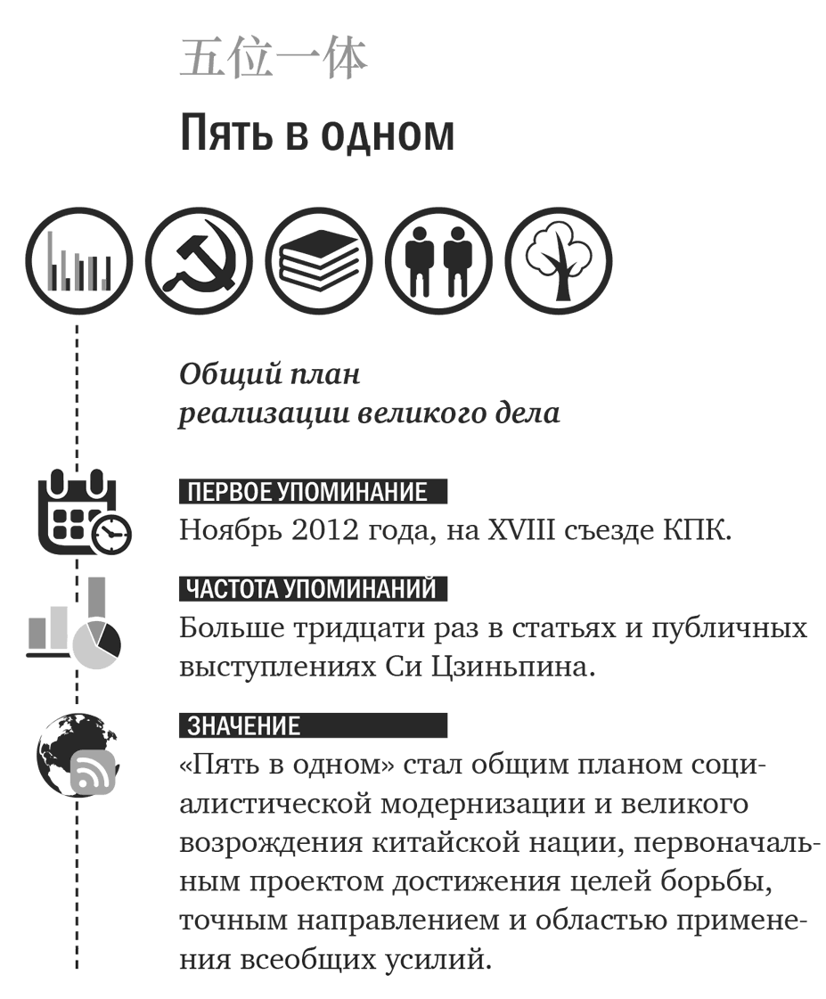 «Пять в одном» – это обобщенная формулировка планов социалистической модернизации, касающихся экономического, политического, культурного, социального и экоцивилизационного строительства.