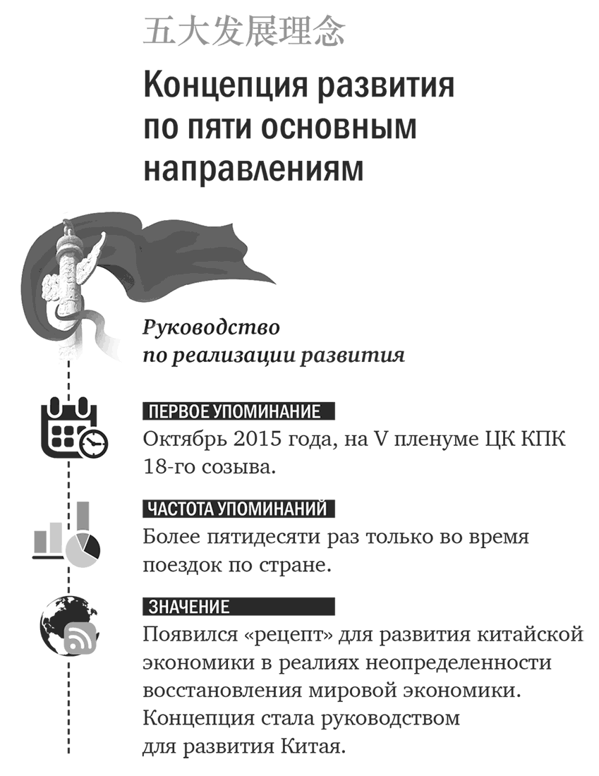 29 января 2016 года, во время проведения коллективного обучения Политбюро ЦК КПК, Си Цзиньпин сделал такое обобщение: «Концепция развития, которая включает инновации, согласованность действий, защиту окружающей среды, открытость и совместное пользование достижений, концентрированно воплотила в себе идеи развития, направление развития, точку приложения сил развития Китая на тринадцатую пятилетку и в более долгосрочной перспективе. Также она стала руководством по управлению общим положением, управлению основами и управлению долгосрочным развитием».