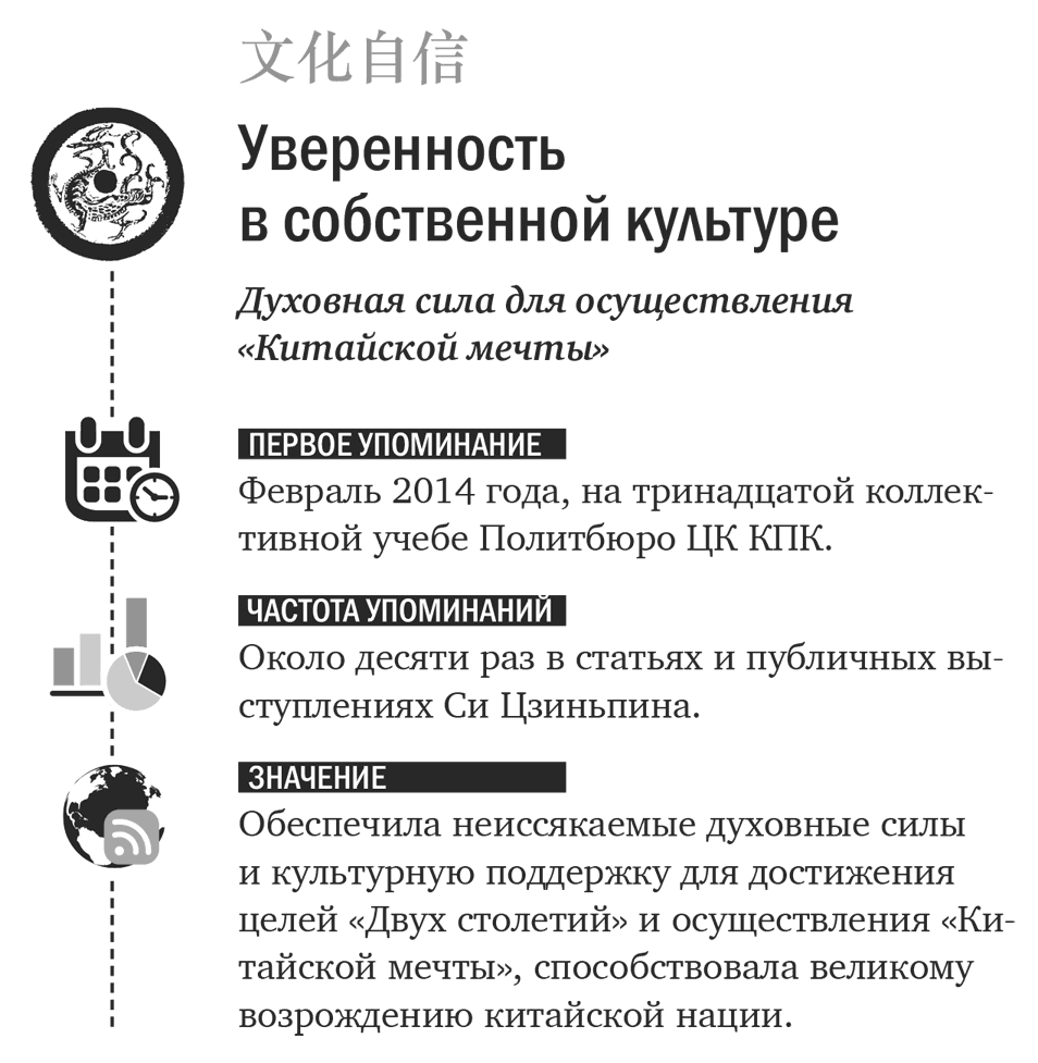 «Уверенность в собственной культуре» занимает четвертое место, после выдвинутых генеральным секретарем Си Цзиньпином «уверенности в собственном пути развития», «уверенности в собственном строе» и «уверенности в собственной теории». С XVIII съезда КПК выражение «Уверенность в собственной культуре» было упомянуто Си Цзиньпином более десяти раз.