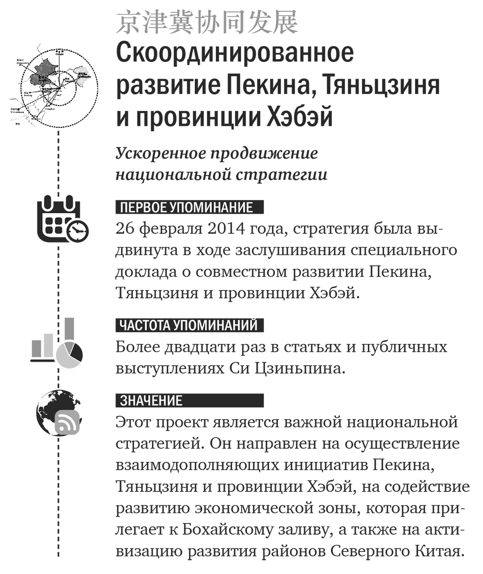 После XVIII съезда КПК Центральный комитет, Генеральным секретарем которого является Си Цзиньпин, не раз обращал внимание на скоординированное развитие Пекина и прилегающих к нему территорий. В октябре 2015 года в «Предложении ЦК КПК о выработке плана тринадцатой пятилетки» подчеркивалось, что «во время расширения пространства для развития» следует отдавать приоритет трем ключевым стратегиям, к числу которых относится скоординированное развитие Пекина, Тяньцзиня и провинции Хэбэй. Нужно поставить во главу угла развитие проекта «Один пояс – один путь», скоординированное развитие Пекина, Тяньцзиня и провинции Хэбэй, создание экономического пояса вдоль реки Янцзы и сформировать вертикальную и горизонтальную экономические оси, в которых главное место будет отведено экономическим поясам, располагающимся на приморских и прибрежных речных территориях и на территориях, примыкающих к маршруту проекта «Один пояс – один путь».