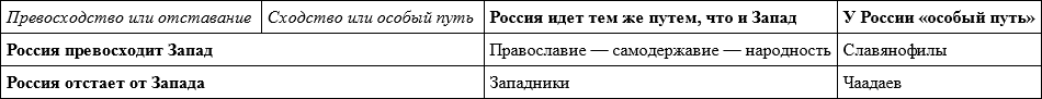Таким образом, спектр идеологических позиций по поводу миссии России и ее места в мире может быть систематизирован на основании ответов, которые давали приверженцы той или иной идеологии на два базовых вопроса: 1) сравнима ли в принципе Россия с Западом, или у нее есть свой особый путь развития и уникальная миссия; 2) уступают ли российские традиции и обычаи западным или превосходят их?