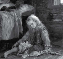 Ослепительный блеск лучинки упал тогда прямо на девочку лет четырех, свернувшуюся клубком между трубой и перекладиной. Подложив обе ручки под щечку, слегка закрасневшуюся, пригнув худенькие длинные ножки к локтям, она казалось миловидною даже под лохмотьями. Продолговатое личико, которому белокурые курчавые и взбитые, как пух, волосы придавали еще более худобы, было схоже во всем с лицом Андрея.