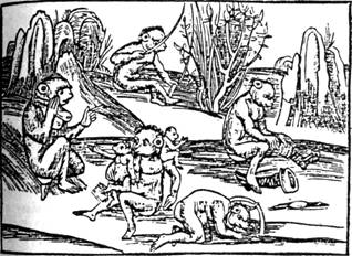 Во многих горных ущельях живет племя людей с собачьими головами. Они одеваются в звериные шкуры, вместо речи издают лай, вооруженные когтями, они питаются охотой и птицеловством. Они считают, что их более ста двадцати тысяч, как пишет Ктесий, а еще в некоем индийском племени женщины рожают один раз в году, и их дети тут же стареют. А еще [есть там] племя людей, которые называются моноколи, у них одна голень, и они удивительно ловко прыгают, они же называются скиоподами, ибо в пору сильной жары, упав навзничь на землю, укрываются тенью своей ноги. Неподалеку от них, по направлению на запад, обитают троглодиты, у которых нет шеи, а глаза на плечах.