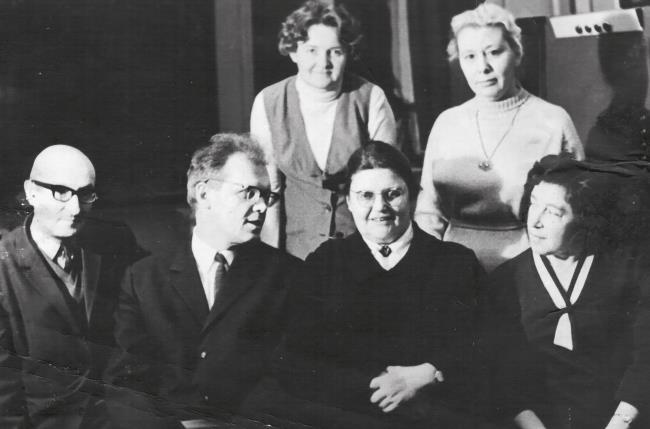 Преподаватели факультета психологии. Сидят (слева направо): Л. М. Веккер, А. А. Бодалев, М. Д. Александрова, В. Н. Андреева.