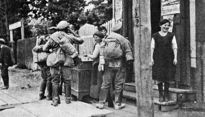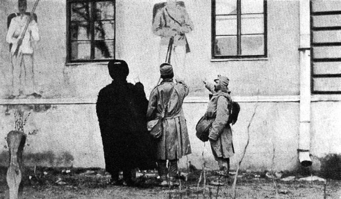 На стенах казарм в Львове изображены формы одежды австрийских войск. Пленные австрийцы дают объяснения их русскому офицеру